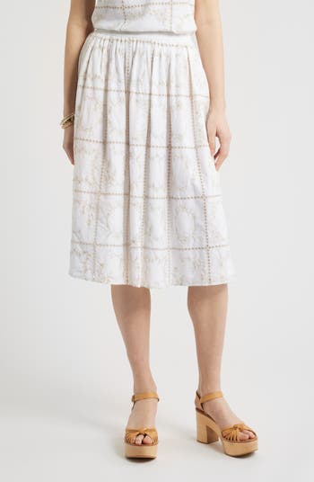 Intersecting stripes of eyelet create a checkered effect across this fresh cotton midi skirt delicately embroidered with florals.