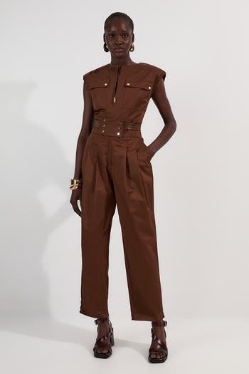 Collarless utility jumpsuit with distinctive faux leather tab detailing. Practical chest pockets with metallic button closures for added functionality. Decorative double-button waist panel creating a flattering silhouette. Front zip fastening for easy wear and contemporary appeal. Relaxed leg shape with practical side pockets for everyday versatility. This cotton & faux leather tab utility jumpsuit from karen millen combines practicality with sophisticated style.