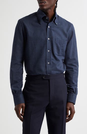 Thom Sweeney's tailored elegance comes through in the brushed cotton flannel and slate-grey shade of this structured button-down.
