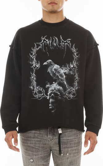 Gothic graphics and raw-cut edges amplify the street-savvy attitude of this slouchy pullover sweatshirt cut from soft cotton French terry.