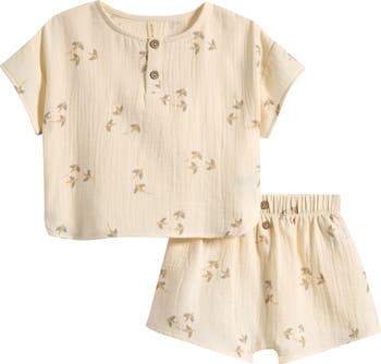Baby can lounge comfortably in the fresh, breathable comfort of this adorable cotton-gauze set featuring a henley-style top and a pair of matching shorts.