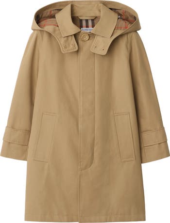 A car coat made from cotton twill with a concealed button closure. The design features a detachable hood and is lined with the Burberry Check in our signature sand colourway.||Single-breasted button closure|Detachable hood|Side welt pockets|Button-tab cuffs|Back vent|Burberry Check undercollar and lining