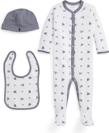 Smooth cotton interlock feels supersoft against baby's skin in this cuddly footie that comes with a coordinating bib and hat to complete their look.