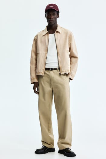 Jacket in woven cotton. Collar, zipper at front, welt front pockets, and long sleeves with button at cuffs. Unlined.