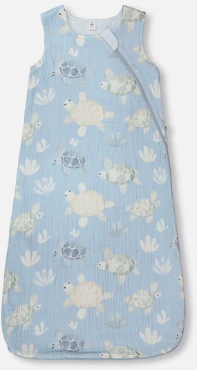 The cotton jersey muslin sleep sack blue with turtle print is designed to keep baby boys comfortable through the night. This sleeveless design features a side zipper opening for easy dressing and a roomy cut that allows freedom of movement while sleeping. Made from breathable cotton with a touch of stretch, it ensures softness, lightness, and security during naps and bedtime. Perfect for warm-weather nights, it blends practicality with a playful ocean-inspired print.