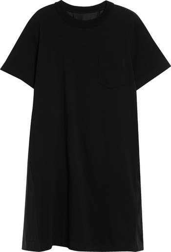 A master of contrarian textures, Chitose Abe employs her spliced technique to create this mixed-media T-shirt dress with smooth jersey in front and crisp nylon in back for a hybrid look that delivers coordinated style in seconds.