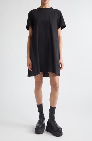 A master of contrarian textures, Chitose Abe employs her spliced technique to create this mixed-media T-shirt dress with smooth jersey in front and crisp nylon in back for a hybrid look that delivers coordinated style in seconds.