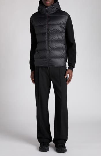 Part cardigan, part puffer, this hybrid style offers lightweight warmth with a combination of cotton knit sleeves and a down-filled nylon core and hood.