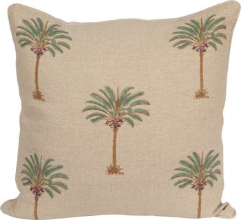 - A stylish square pillow featuring block-printed palm trees in natural, green, and brown tones