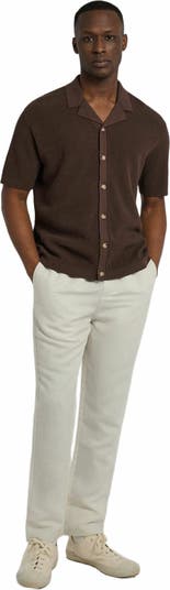 - Ideal for warm days, in a cotton-linen blend, this knit button-down is relaxed-fitting, with short sleeves, a camp collar and a straight hem.