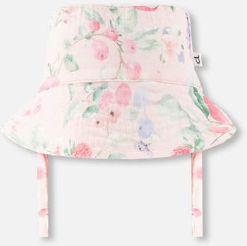 Shaded adventures are even sweeter with the cotton muslin hat pink with printed berries. This bucket hat features a wide brim, an allover berry print, and adjustable chin straps to keep it securely in place. Made from breathable cotton muslin, the fabric is soft, lightweight, and ideal for sunny summer days. A playful essential from our "Blueberry Cuddles" collection that protects little girls while adding a stylish touch.