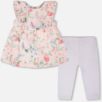 The cotton muslin tunic and rib jersey leggings set pink with printed berries and lilac is a cheerful outfit for baby girls. The sleeveless tunic charms with flutter frills, a gathered waist, and a berry-and-butterfly print that feels like a summer orchard. Paired with lilac rib leggings with an elastic waist, the set offers stretch, breathability, and all-day comfort. Perfect for warm-weather play or festive strolls, it balances sweetness with practicality. A poetic piece from our "Blueberry Cuddles" collection that brightens every occasion.