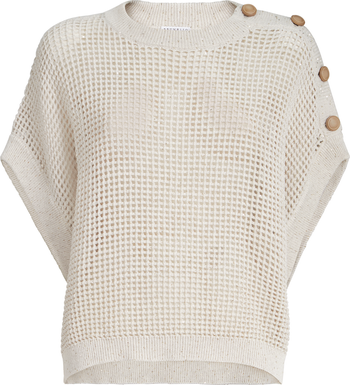 The cotton yarn is delivered in refined, airy, net-like knitting. The sequin detail embellishes the yarn’s essential nature.