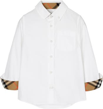 A long-sleeved cotton Oxford shirt with a neat button-down collar. Turn back the cuffs to show the Burberry Check lining in signature sand beige.||Button closure|Button-down collar|Chest patch pocket|Single-button cuffs|Curved hem