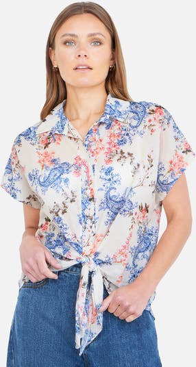 This short-sleeve button-down shirt is crafted from 100% cotton, offering a soft, breathable feel perfect for everyday wear. It features a charming paisley print, complemented by a front tie that adds a relaxed, modern twist. Lightweight and easy to style, it brings a fresh, feminine touch to casual outfits.