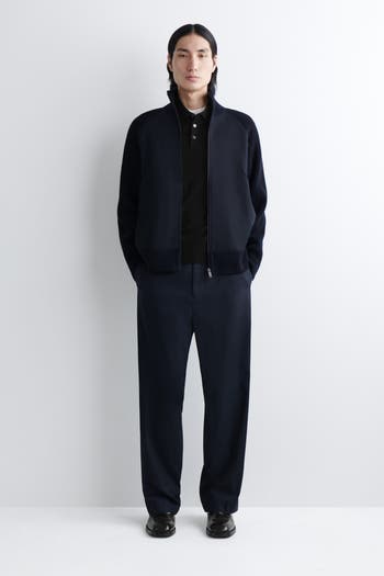 The menswear team borrow from '80s sportswear codes for the new season. Offered in classic navy, this track jacket is knitted from premium merino wool and designed with a cotton panel at the front. It features a mock neck, raglan sleeves, and welt pockets.