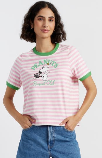 This pink and cream striped Peanuts Racquet Club t-shirt, made from soft organic cotton, brings a playful pop of color to your wardrobe. Featuring a fun printed design with contrasting green trims, it adds a sporty and stylish touch to any look. Lightweight and breathable, it's perfect for warm days or layering for cooler evenings.