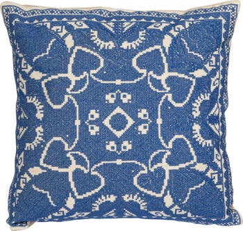 - A delightful square pillow featuring an embroidered design in blue and natural tones