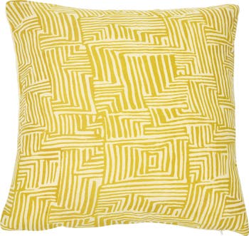 - Square cotton throw pillow with kuba cloth pattern in mustard; Natural pleated cotton encasement on back