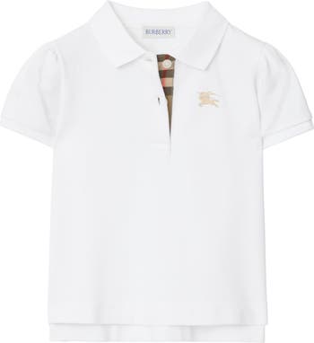 A polo shirt in cotton piqué, lined at the placket with Burberry Check in signature sand beige. The style is shaped with subtle puff sleeves and scalloped trims.||Button placket|Rib-knit trims|Embroidered Equestrian Knight Design at chest