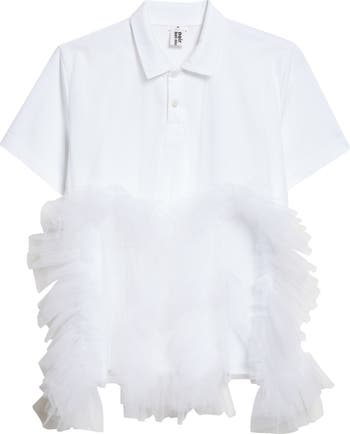 Kei Ninomiya proves his status as an experimental fashion icon, remixing the standard preppy polo with this smooth cotton-ponte version that flows into froufrou tulle ruffles, bringing dramatic volume to the look.