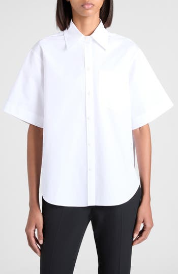 A classic silhouette gets updated through the label's sharpened lens in this cotton-poplin button-up tailored in a boxy shape with wide, elbow-length sleeves.