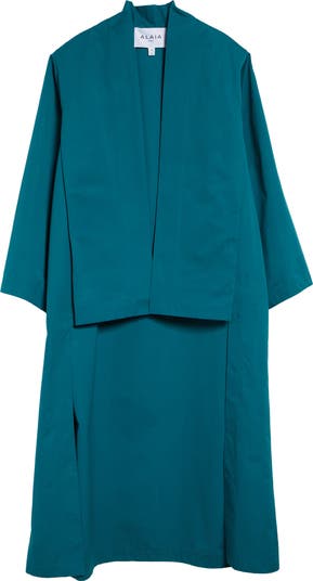 This robe-inspired coat featured on the spring '26 runway is cut with a dramatic high-low hem from crisp cotton poplin dyed in a rich, deep hue. An upright stand collar and wide sleeves bring a casual yet refined feel to the carefully sculpted design.