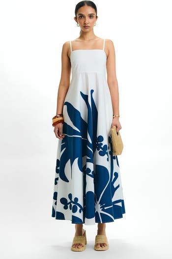This strappy midi dress features a fitted bodice and flowing A-line skirt for an elegant, effortless silhouette. Adjustable straps, side pockets, smocking, and a back zipper with elastic ensure comfort and ease. The Ula print draws from coastal hibiscus and Hawaiian island flora while merging mathematical concepts with geometric forms that blossom organically, symbolizing resilience and calm.