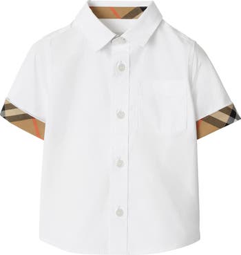A short-sleeved cotton poplin shirt with a neat point collar. Turn back the cuffs to show the Burberry Check lining in signature sand beige.||Button closure|Point collar|Chest patch pocket|Curved hem
