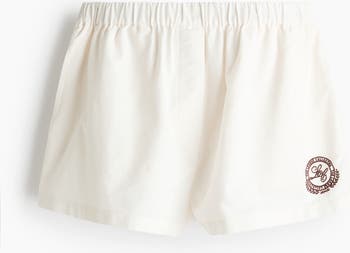 Loose-fit shorts in a cotton weave with covered elastication at the waist. Fake fly, discreet side pockets and an embroidered motif at one side.