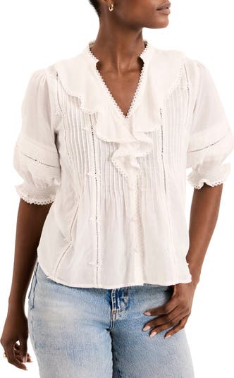 This cotton ruffle blouse brings soft romance to everyday dressing with its delicate detailing and airy feel. Crafted from lightweight cotton, it features a flattering split neckline framed by gentle ruffle trim, vertical pintuck detailing through the bodice, and short puff sleeves finished with scalloped edges. The relaxed silhouette drapes beautifully for all-day comfort while maintaining a polished look. Perfect for pairing with denim or tailored bottoms, this blouse adds effortless femininity to both casual and refined outfits.