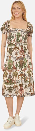 In a gorgeous all over safari print and made from a lightweight cotton this is perfect for tropical getaways, The ruched bodice is super flattering and comfortable, with cute puffed sleeves and a square neckline. The midi length makes this perfect to wear with sandals or trainers for everyday.