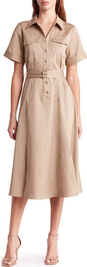 Perfect for work or play, this belted shirtdress is designed with flap pockets and abbreviated cuffed sleeves.