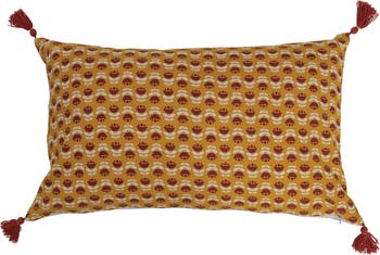 - Rust and mustard cotton slub lumbar pillow with floral print and tassels; White cotton encasement on back