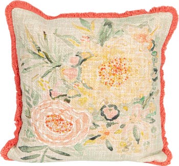 - A charming square pillow featuring a floral design with embroidery and eyelash fringe in multicolor