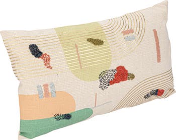 - A colorful and textured cotton slub lumbar pillow that features a printed design with hand-embroidery and beads
