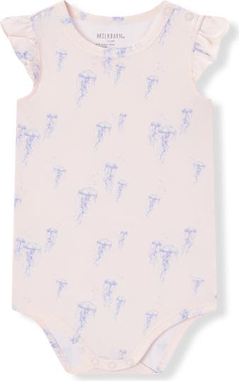 Our adorable baby Cotton Stretch Ruffle One Piece merges understated form and functionality. The envelope neckline and ring-snap closures allow for effortless, one-handed undressing of your little one. The contrasting edging highlights the structure and fabric design. Complete your little one’s ensemble by pairing this One Piece with other Milkbarn treasures. Cotton Stretch: Created of 95% cotton and 5% spandex, the lightweight, breathable, and buttery-soft qualities of our One Pieces naturally comfort sensitive skin.