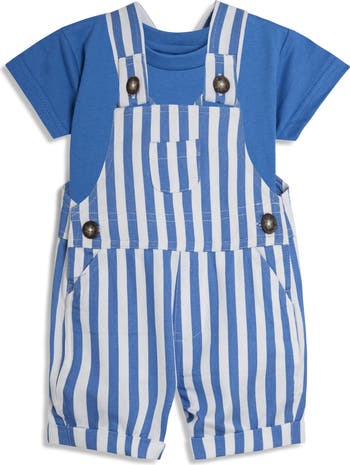 Stripes give a nod to nautical flair as your favorite little one plays in this cotton set featuring a solid T-shirt and adorable overalls.