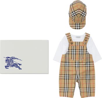 A pair of cotton corduroy dungarees with a matching bucket hat, and a cotton shirt woven in Italy with the Burberry Check.| |Dungarees: button closure, front patch pocket, press-stud gusset|Shirt: button closure, point collar|Presented in a Burberry gift box