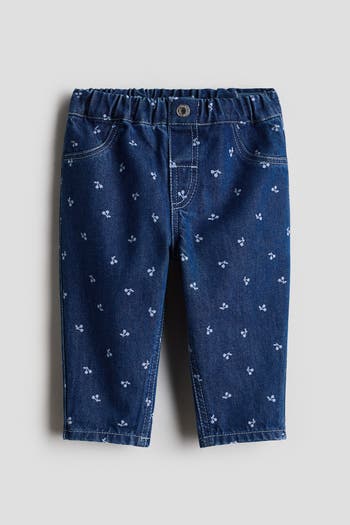 Trousers in a soft cotton weave with an adjustable, elasticated waist, fake fly with a press-stud, decorative front pockets and an open back pocket.