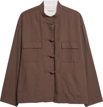 Fastened with Asian-inspired toggle buttons and loops, this boxy cotton jacket is topped with a mandarin collar and equipped with utility-style pockets, showcasing Jun Takahashi’s signature streetwear aesthetic.