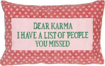 - A playful lumbar pillow featuring a polka dot pattern and the phrase "Dear Karma I have a list of people you missed" embroidered in whimsical script