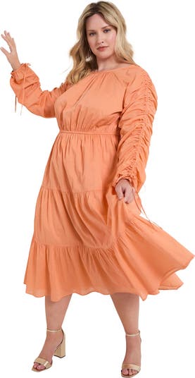 This charming maxi dress combines a flattering drawstring waist with ruched raglan sleeves and tiered skirt for an effortlessly elegant look. Delicate gathering along the neckline and sleeves adds soft volume, while the self-tie details and keyhole back give it a refined, feminine finish. Perfect for both casual and special occasions.