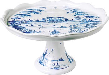 Layers of the brand's artisanal glazes create the pattern of this ceramic cake stand that brings an idyllic scene of a country estate to your tablescape.