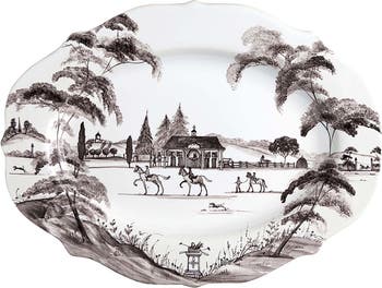 Layers of the brand's artisanal glazes create the pattern of this ceramic platter that brings an idyllic scene of flora and fauna from a country estate to your tablescape.