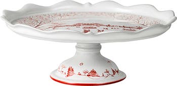 Layers of the brand's artisanal glazes create the pattern of this ceramic cake stand that brings an idyllic scene of a country estate to your tablescape.
