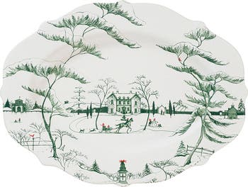 Cozy vibes abound on this platter decorated with a snowy country-estate pattern in evergreen hues that evoke all things holiday.