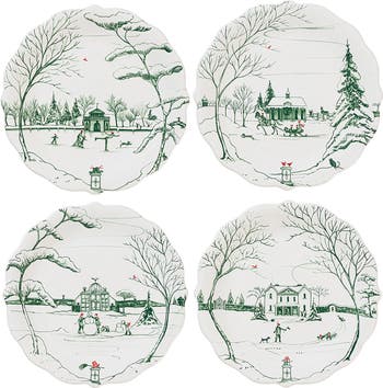 Cozy vibes abound on these party-ready plates decorated with a snowy country-estate pattern in evergreen hues that evoke all things holiday.