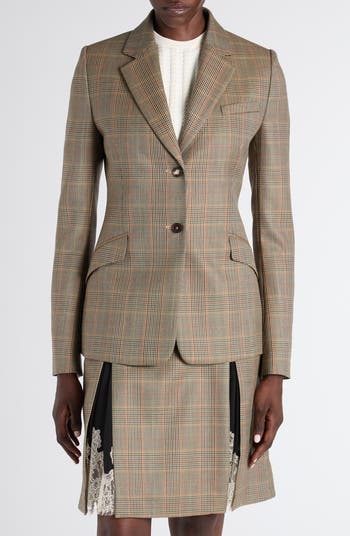 In true McQueen tradition, Seán McGirr marries British heritage and sculptural tailoring in this classically checked Italian-wool blazer with bold shoulders and sharply angled pockets defining the striking hourglass silhouette. At the nape, silvery T-Bar hardware evokes the Albert chains of Victorian pocket watches.