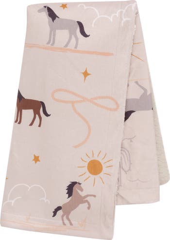 This soft and cozy cowboy/cowgirl themed baby blanket has a minky front with a luxurious white faux shearling back. It is 30 inches by 40 inches in size and features playful horses, cowboy hats, boots, wagon wheels, cacti, sun, moon, and clouds. This blanket captures the rustic charm of the frontier with a modern sophisticated touch. It makes a great baby shower gift or welcome home baby gift.